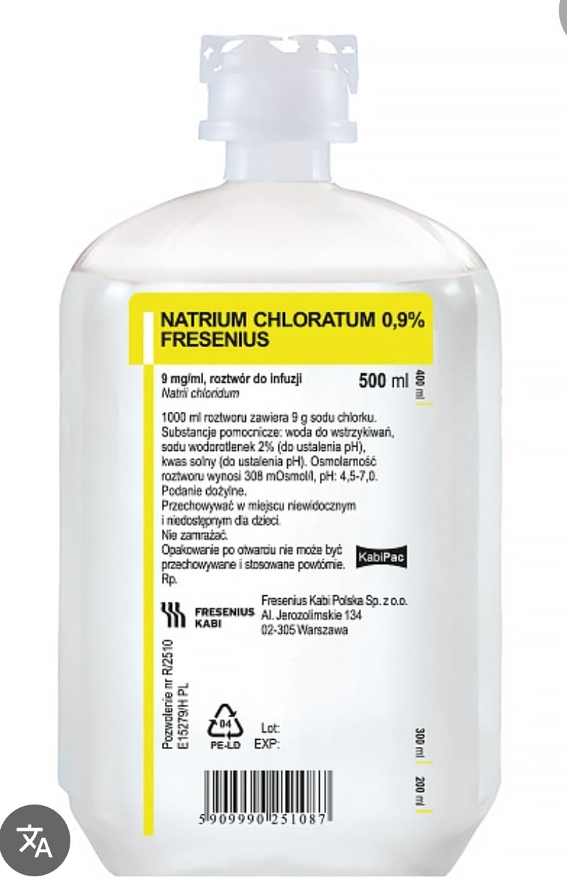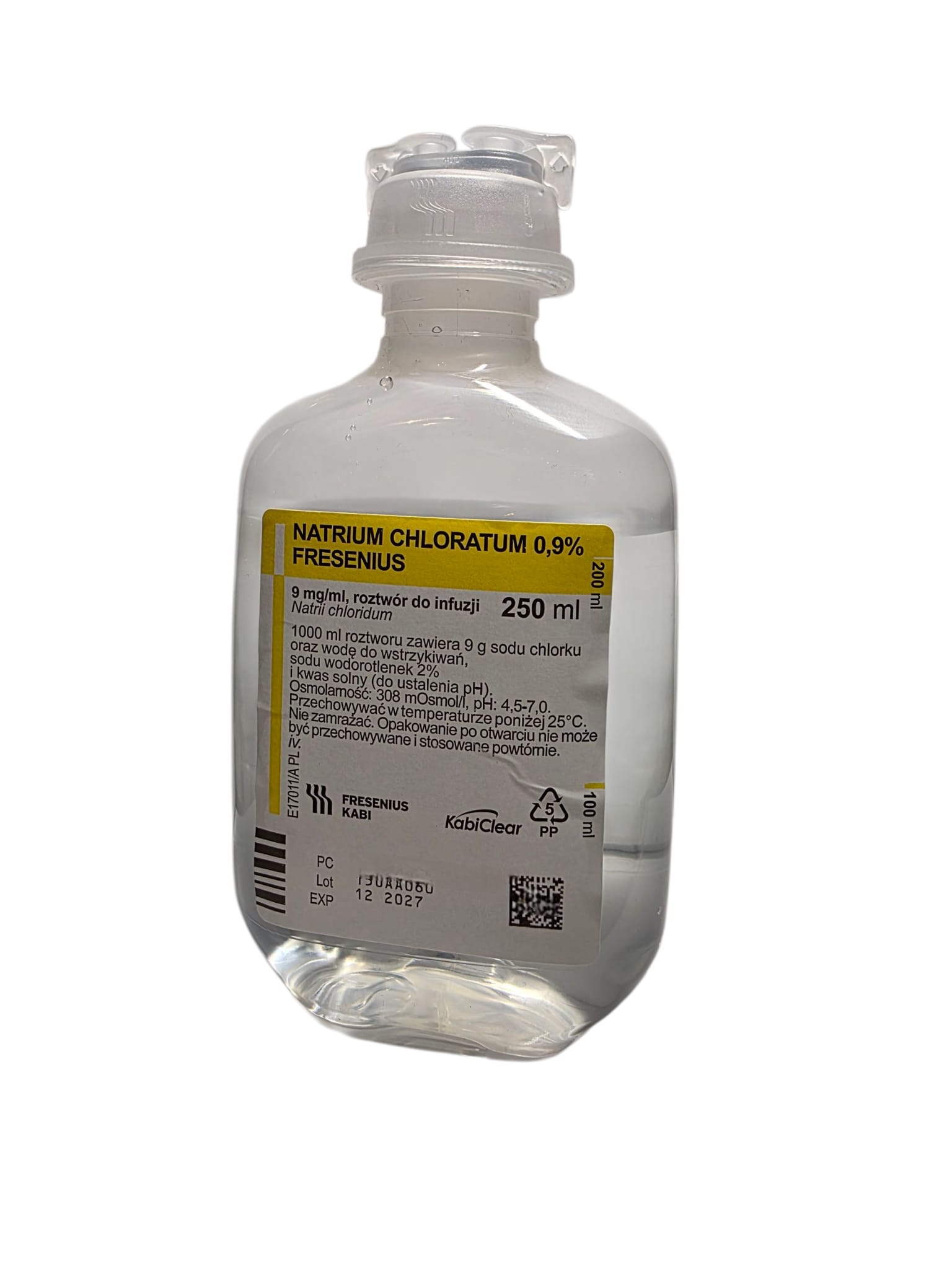 Natrium Chloratum 0,9% Fresenius to izotoniczny roztwór chlorku sodu, który uzupełnia wodę i elektrolity (sód oraz chlorki) w organizmie. Stosowany jest do infuzji dożylnej.